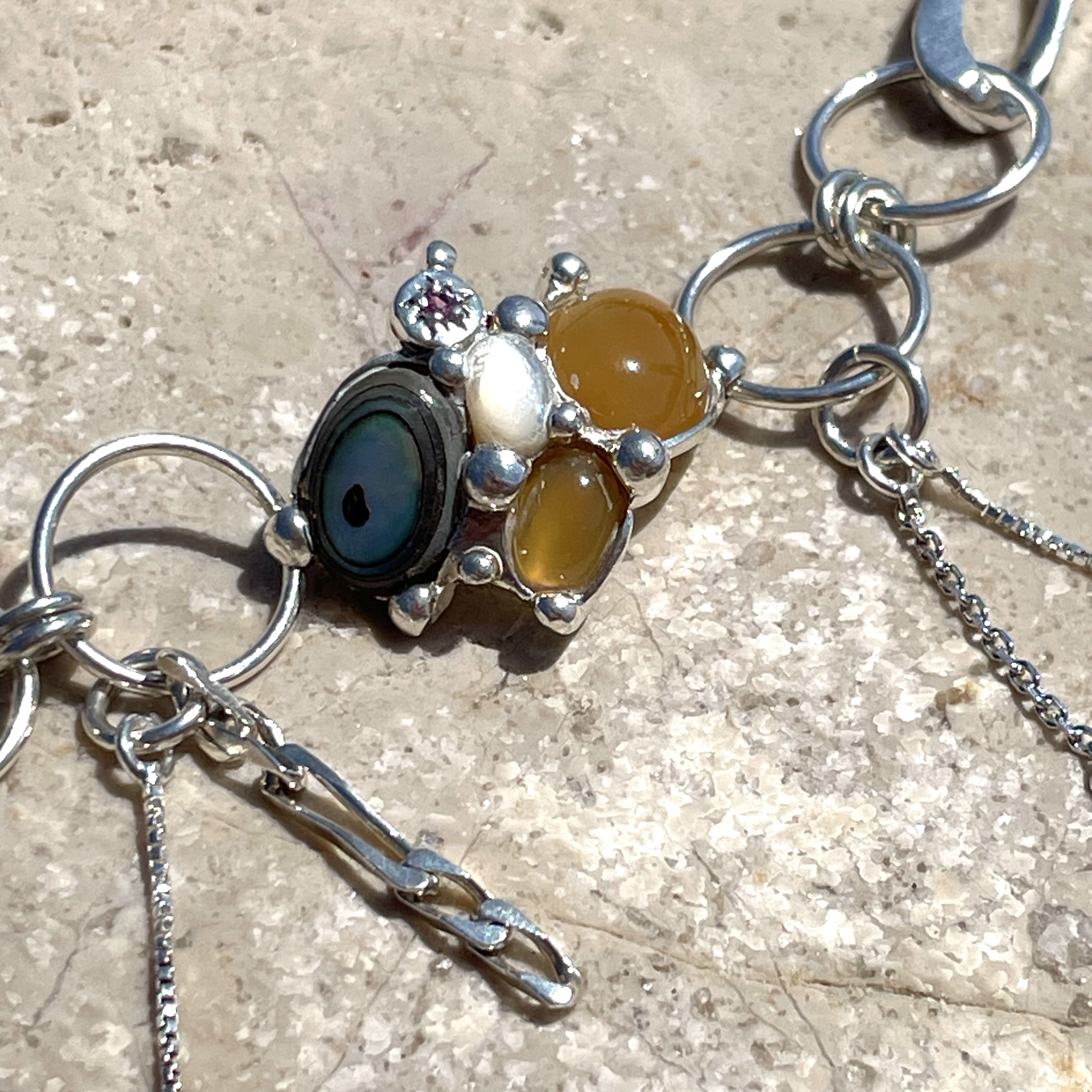 La collection MUSE c’est construite autour d’une série de bagues abimées, sur lesquelles ont été récupérés les plus belles parties serties de pierres fines, chacune transformé en pendentif central orné d’un assemblage d’anneaux fait sur mesure et de chaines sélectionnées et restaurées avec soins.
